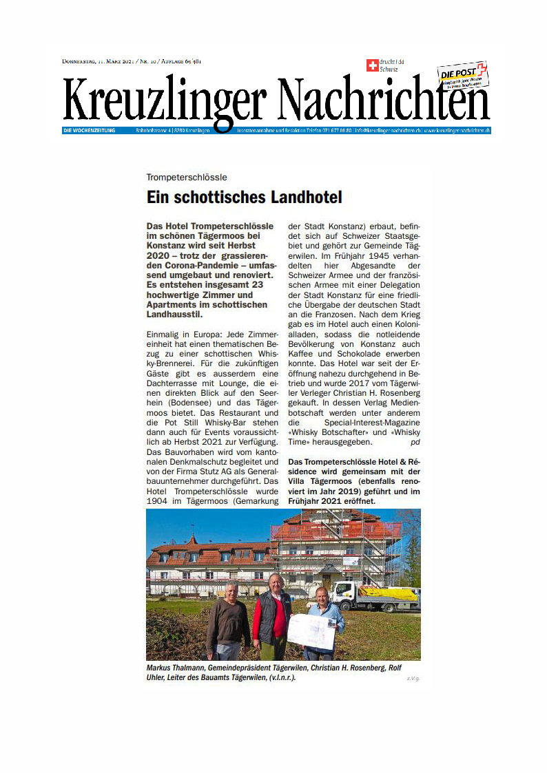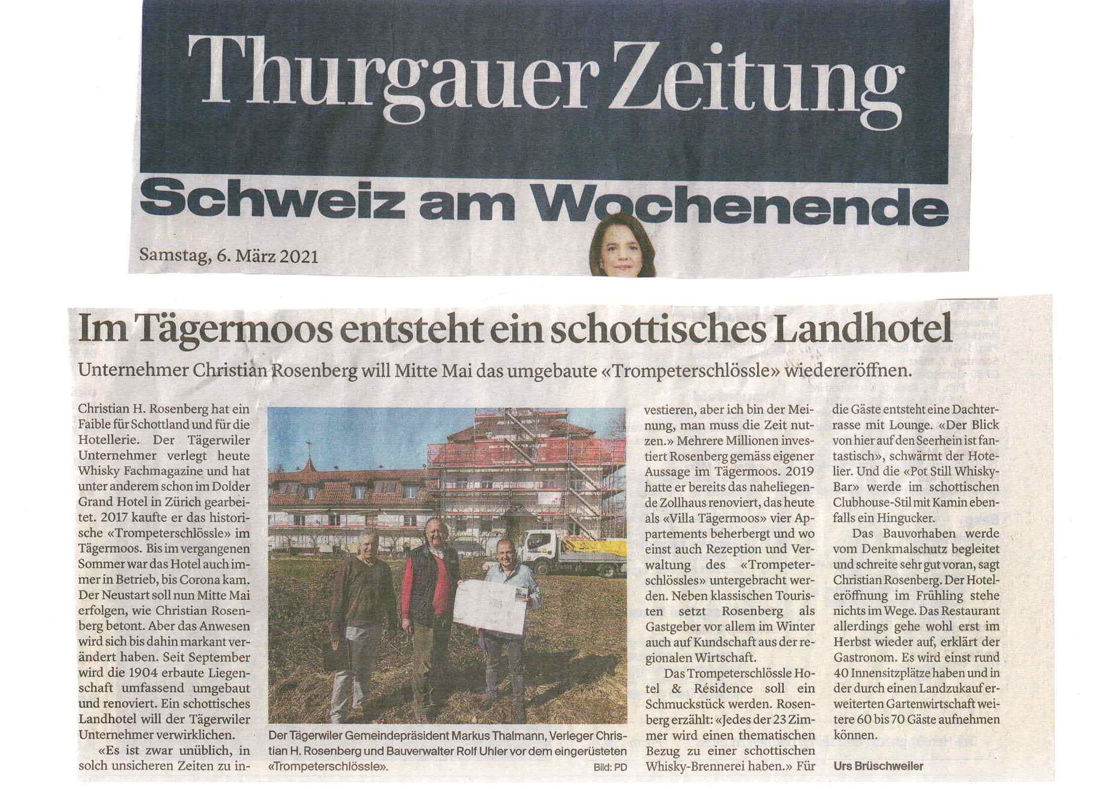 Im Jahr 2017 wurde das Hotel von der Familie um den Thurgauer Verleger Christian H. Rosenberg erworben. Momentan wird das Hotel in Zusammenarbeit mit dem Amt für Denkmalschutz des Kantons Thurgau aufwendig umgebaut. So warten demnächst 23 Hotelzimmer und Suiten im schottischen Landhausstil sowie ein Restaurant und eine Whiskybar auf die Besucherinnen und Besucher.
