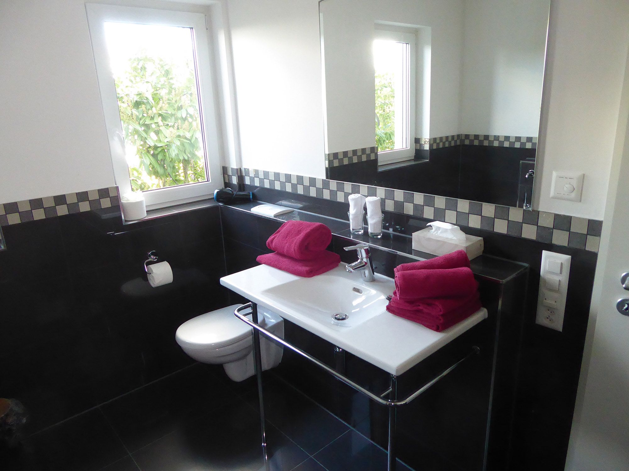 • Badezimmer mit Dusche, WC, Kosmetikspiegel, Föhn
